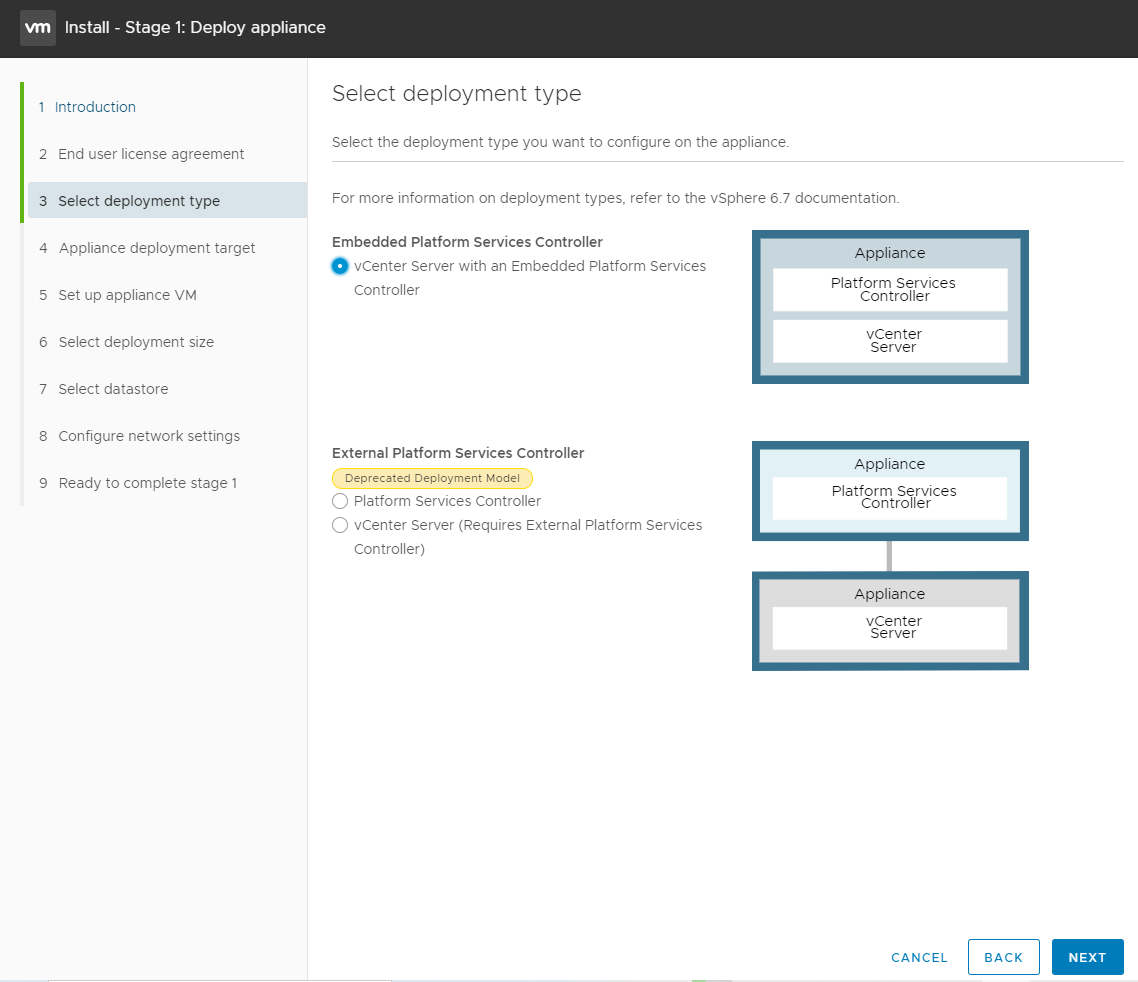 내장 된 Platform Services Controller 를 사용하면 단일 사이트가있는 자체 vCenter Single Sign-On 도메인이있는 독립 실행 형 배포가 수행된다.
