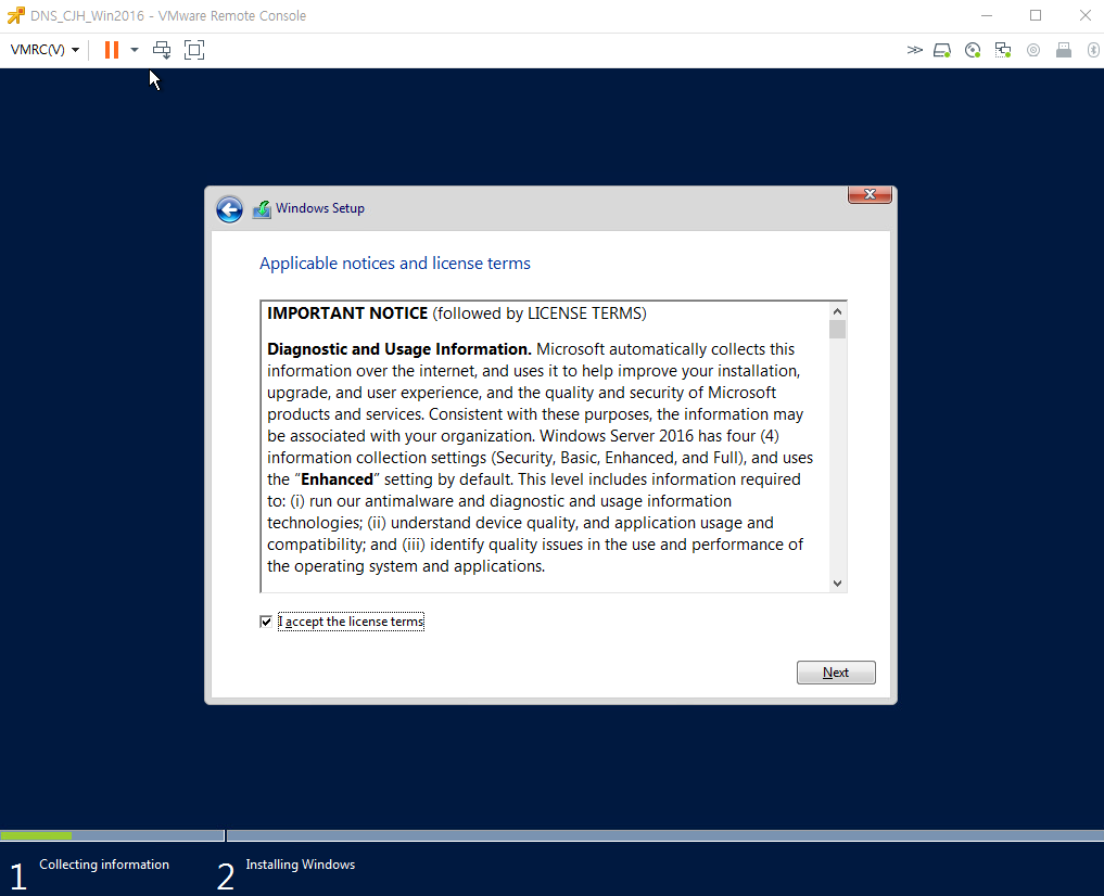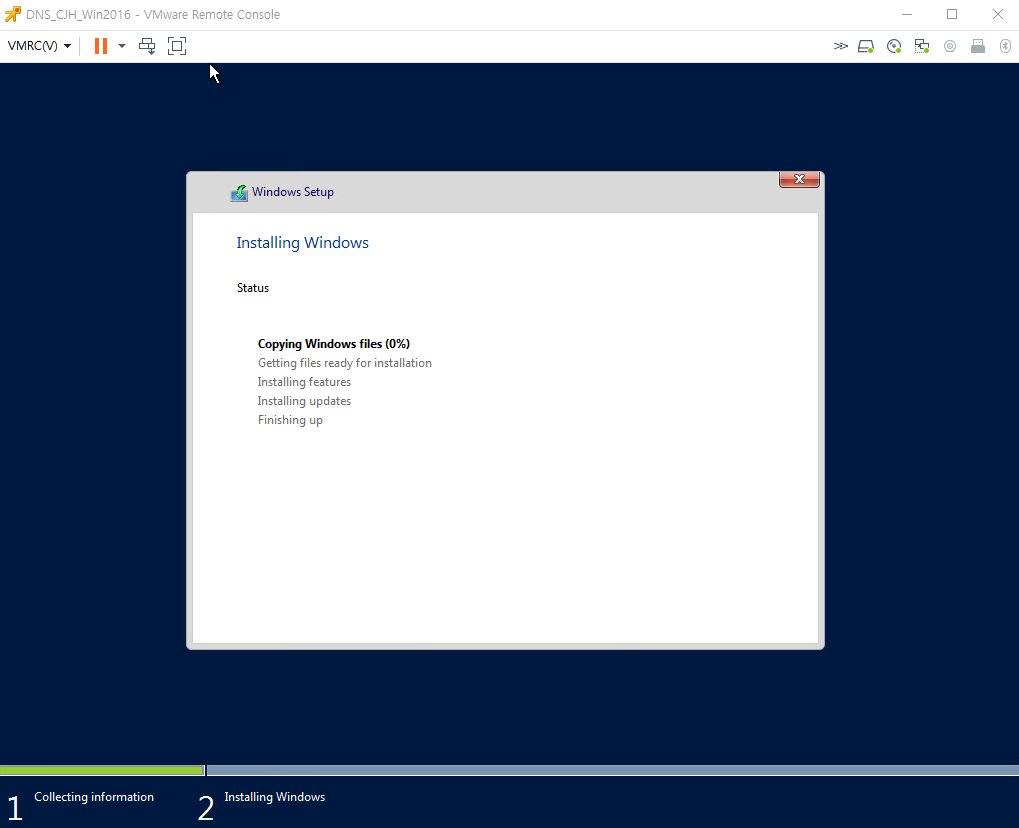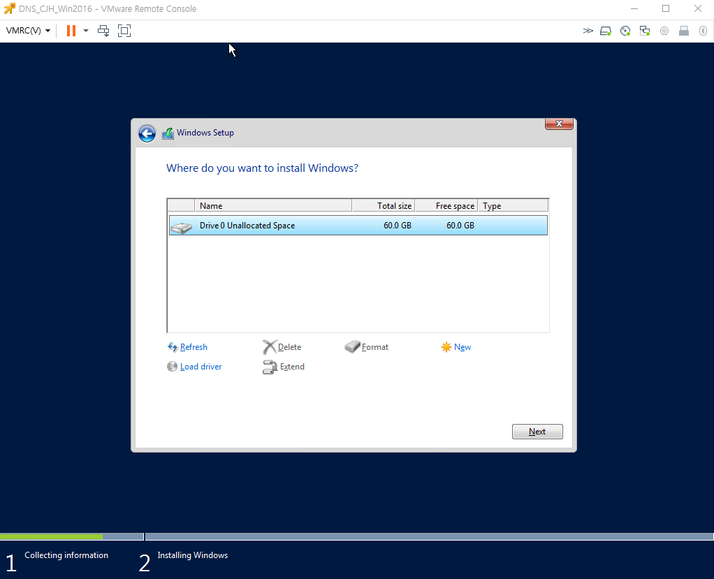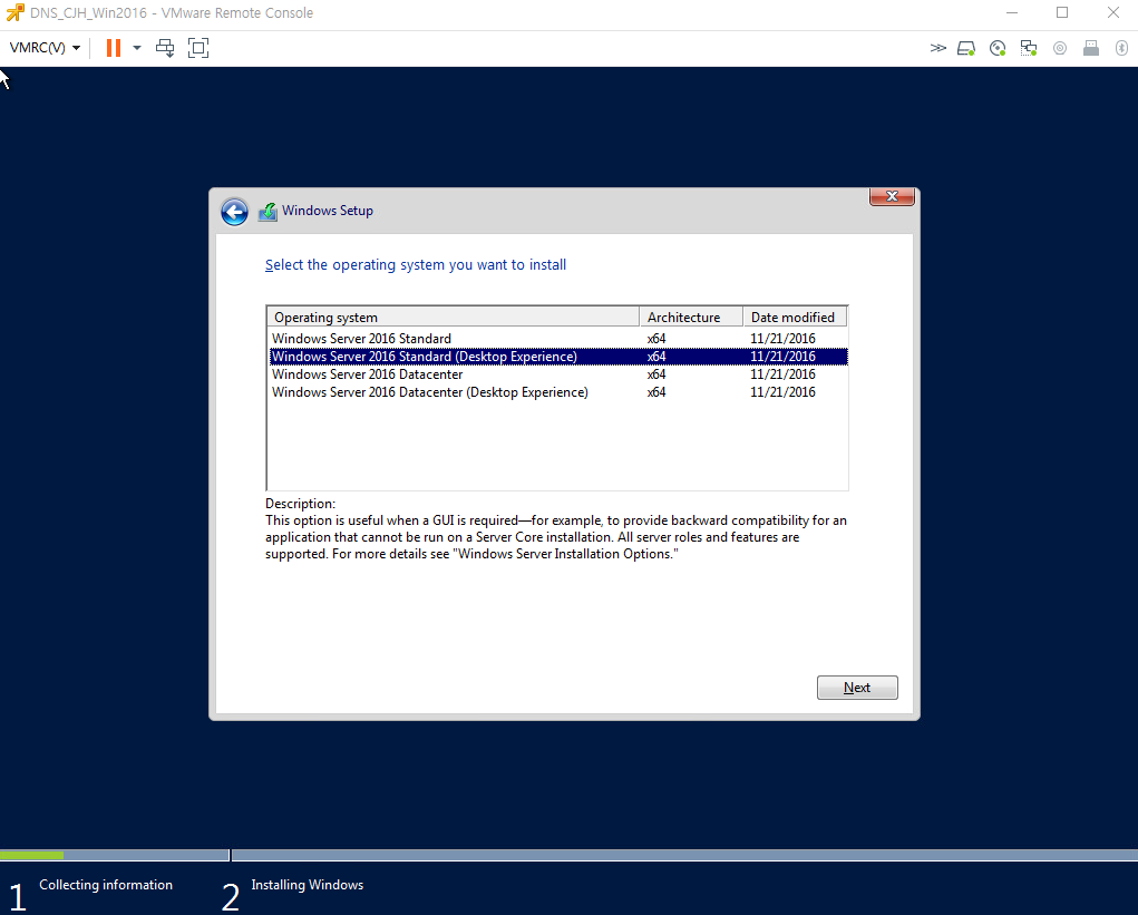 DNS 구축을 하기위해 가상머신에 Windows Server 2016을 설치하기로 하였다.