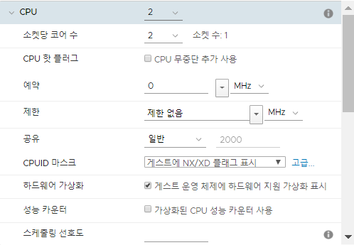 우선 기본 cpu 코어 개수를 설정한 후 > 를 눌러 자세히 보기를 한다.